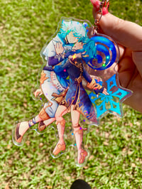Genshin charms with two characters in a singular charm ! Xiao / Venti, Barbara / Xinyan. Also, a larger 5 inch charm Xingqiu / Chongyun and Kazuha / Gorou