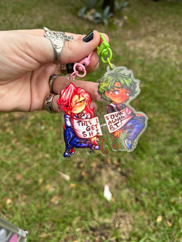 Sk8 the Infinity OVA/teenager Joe and Cherry “This is our get along shirt” Magnet keychain. Sold as a set.